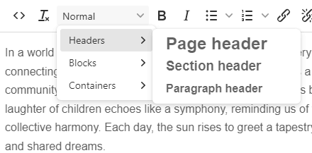 When using the Rich Text Editor datatype in Umbraco, the formatting dropdown options are configurable, letting editors apply styles to their WYSIWYG content. The WYSIWYG editor is powered by TinyMCE.